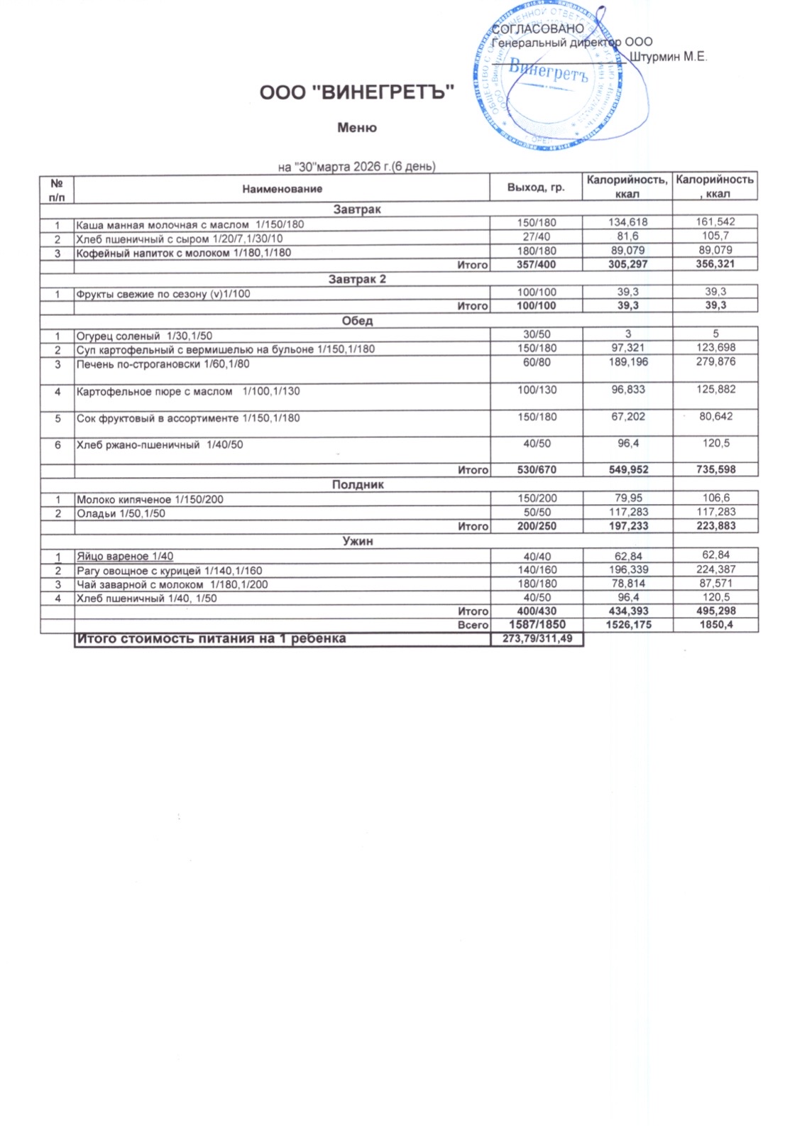 Меню ежедневного горячего питания