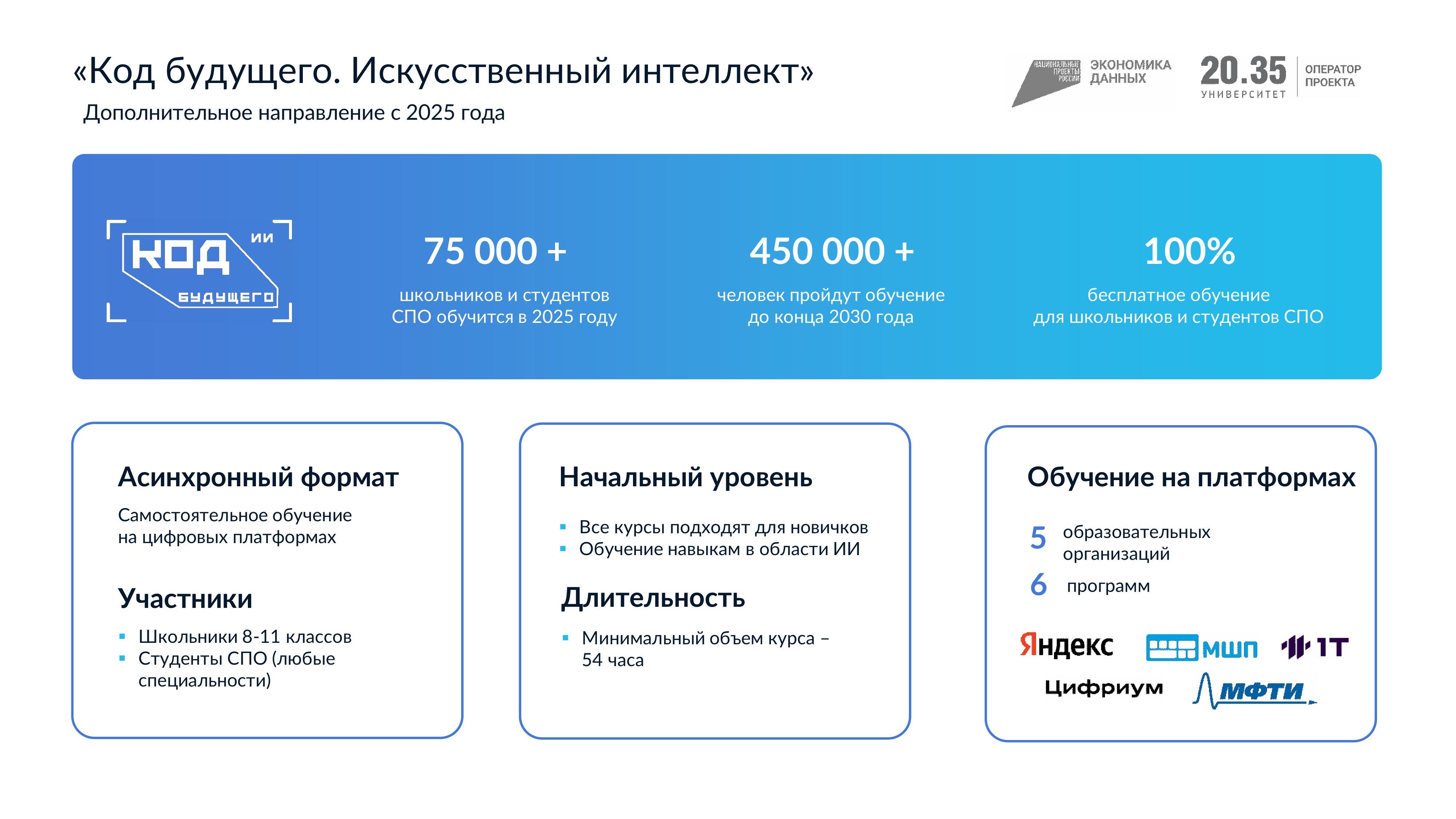 Ознакомиться с полным перечнем образовательных организаций (провайдеров) и курсов, а также подать заявление на участие в Проекте можно на сайте проекта на ЕПГУ по адресу https://gosuslugi.ru/ai.